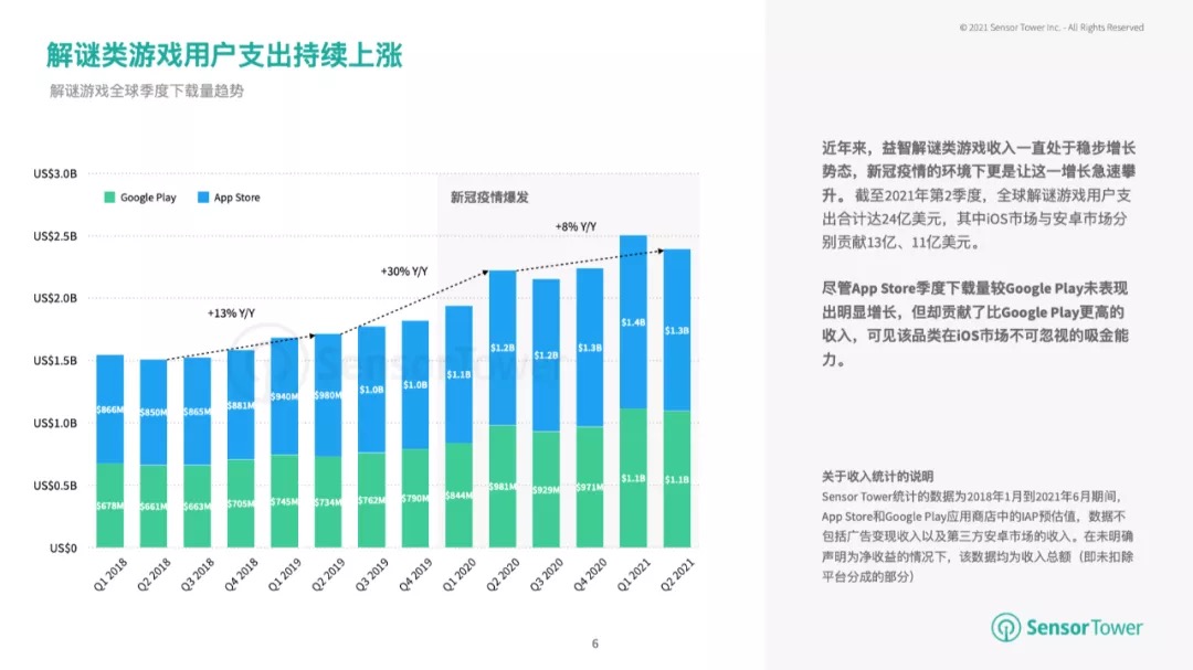 近年来,益智解谜类游戏收入一向处于稳步增加势态,这一趋势在新冠疫情影响下持续扩展。2021年第2季度,全球解谜手游用户开销到达24亿美元,体现仅次于2021年第1季度。